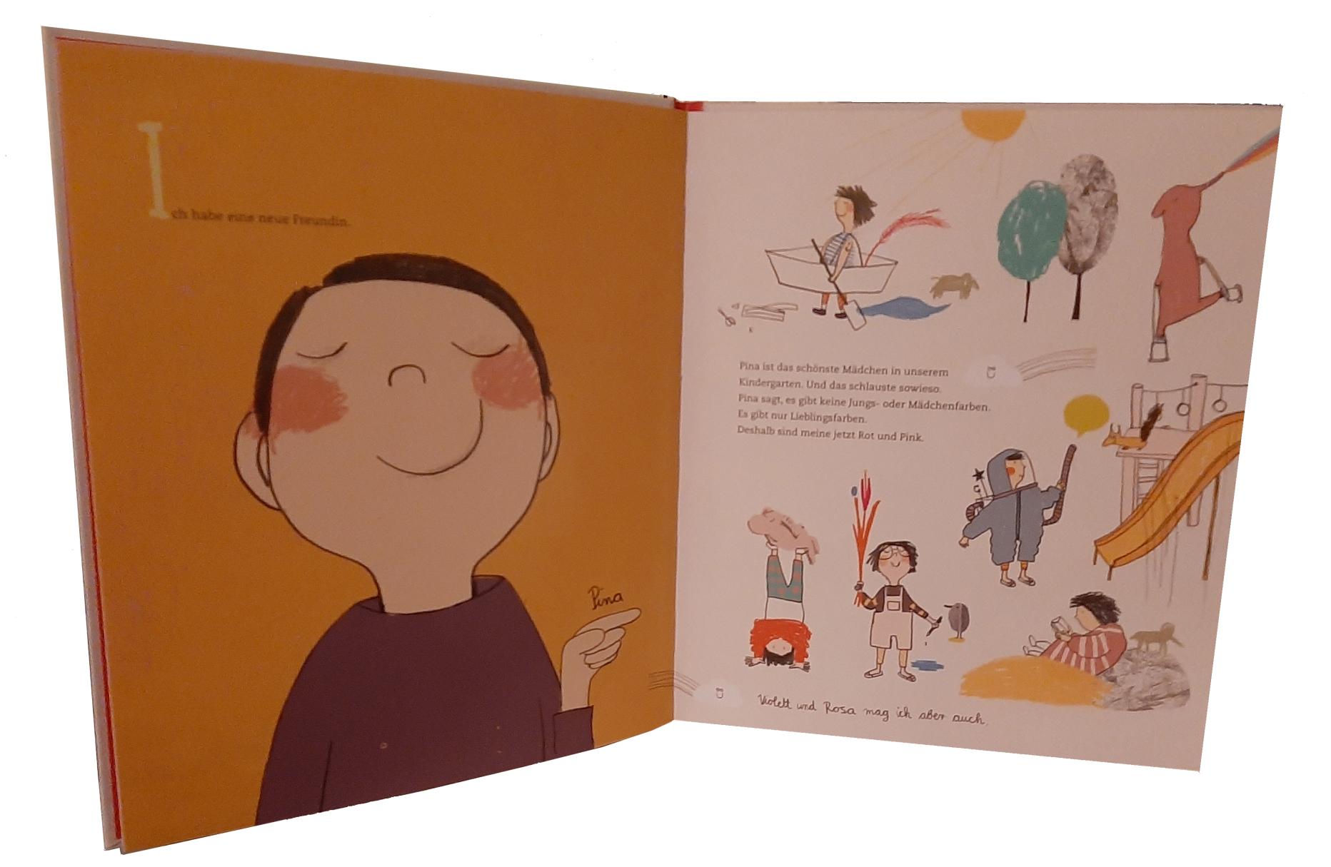 Nicht zuletzt deswegen hat Frauke Angel, die sich die Geschichte ausgedacht hat, diesem jungen Erzähler viele andere Menschen – Kinder, aber auch Erwachsene – zur Seite gestellt, die ihn bestärken. Gleich zu Beginn erfahren wir: „Ich habe eine neue Freundin. Pina.“ Sie ist das schlaueste Mädchen im Kindergarten. „Pina sagt, es gibt keine Jungs- oder Mädchenfarben. Es gibt nur Lieblingsfarben.“