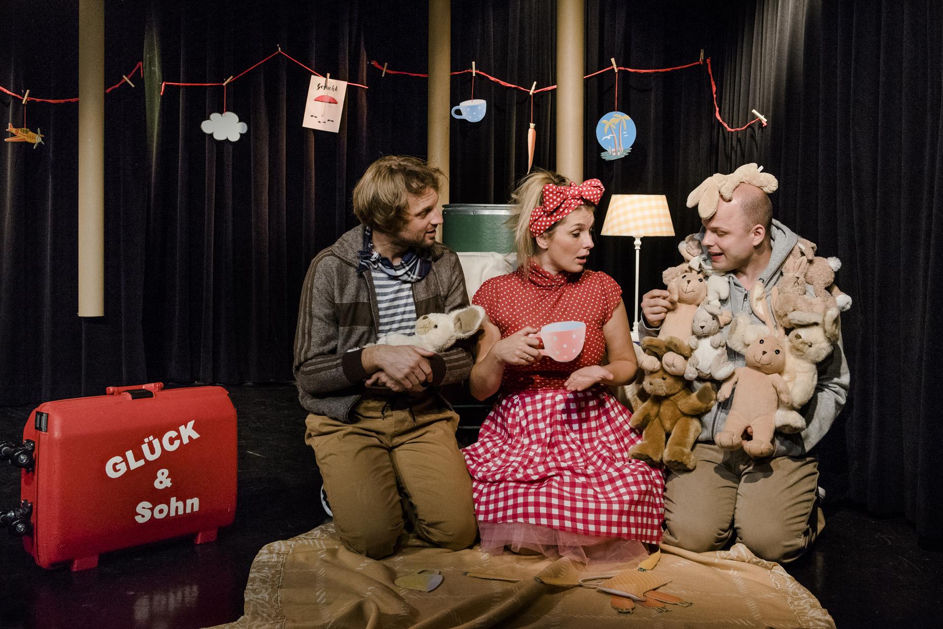 Unwetter hat den wundervoll (beschriebenen) Bau des Bibers vernichtet. Dafür aber einen roten Koffer angeschwemmt. „Glück & Sohn“ steht drauf. Selbstlos wie diese Figur ist, macht sich der Nager (zwischen stark und schüchtern pendelnd gespielt von Florian Haslinger) vor allem auf die Suche nach den rechtmäßigen Besitzern. Könnte aber auch eine Besitzerin und ihr Sohn sein, erfährt er von der ebenfalls suchenden schlauen, schlagfertigen Maus (liebevoll stark, selbstbewusst mit einem Schuss frech: Sophie Prusa) auf die er bei seiner Wanderung trifft. Die vermisst seit dem Unwetter ihren geliebten roten Schirm, der für sie viel mehr als ein Regenschutz ist.