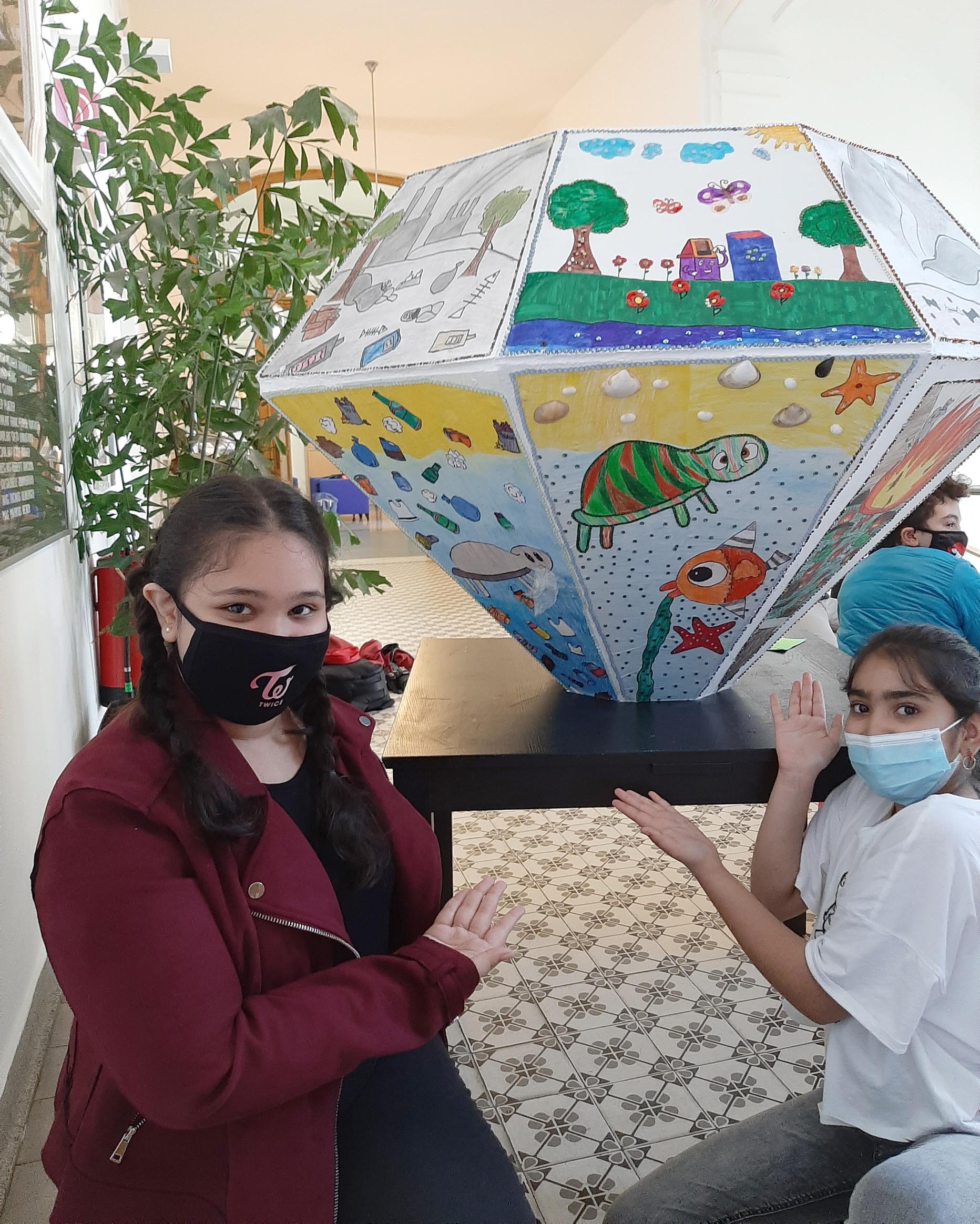 Die 24 Schüler_innen der Klasse haben die einzelnen Seiten des Kristalls bildhaft mit Umweltthemen bemalt – immer mit zwei gegensätzlichen zum selben Thema. So zeigen Kusum und Valentina ihre beiden Meeresbilder. Auf einer der Kristallflächen haben sie das Problem des Plastikmülls gemalt – wobei sie sogar in die dritte Dimension gegangen sind. Der gemalten Meeres-Schildkröte haben sie einige Plastikstücke vors Maul geklebt. Die zweite Fläche zeigt den Idealzustand eines sauberen Ozeans ganz ohne Plastik und anderem Mist.