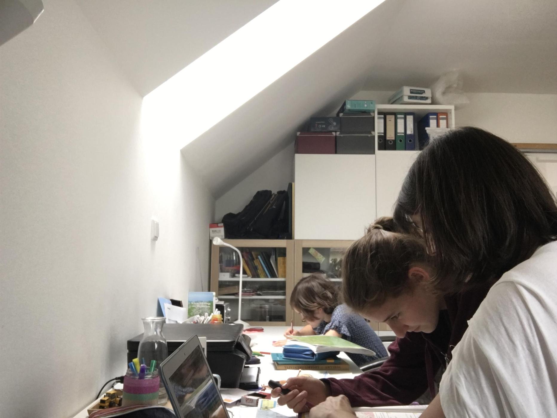 Wenn's schon etwas eng wird: Sarah arbeitet im Home-Office, Tochter Johanna verfasst eine Wegbeschreibung und ihre Schwester Theresa rechnet mit Kilo-Aufgaben.