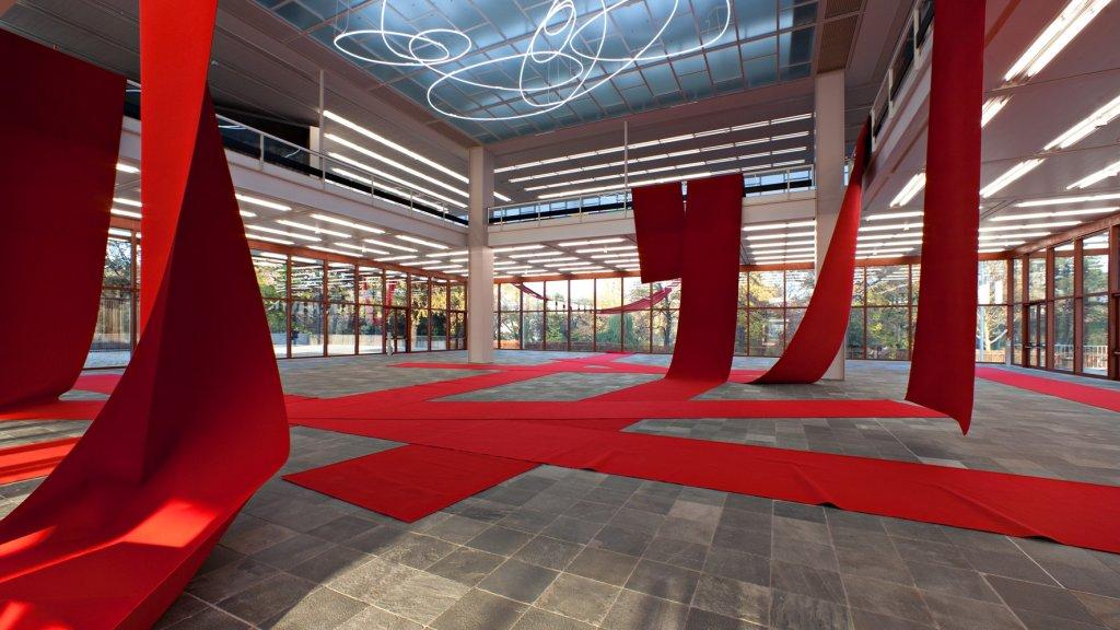 Der rote Teppich ist ausgerollt: Er verläuft kreuz und quer durch den großen Saal des neu eröffneten 21er Hauses, schlingt sich über die Balustraden, ist mal Vorhang, mal Flagge. Die Leere im Saal kann die von Künstler Marcus Geiger gehängte Stoffbahn allerdings nicht kaschieren, und sie ist schon gar nicht das, was man sich zur Eröffnung eines 31,9 Millionen teuren Museums-Umbaus erwartet hätte: Ein Paukenschlag, oder zumindest ein Aha-Erlebnis.