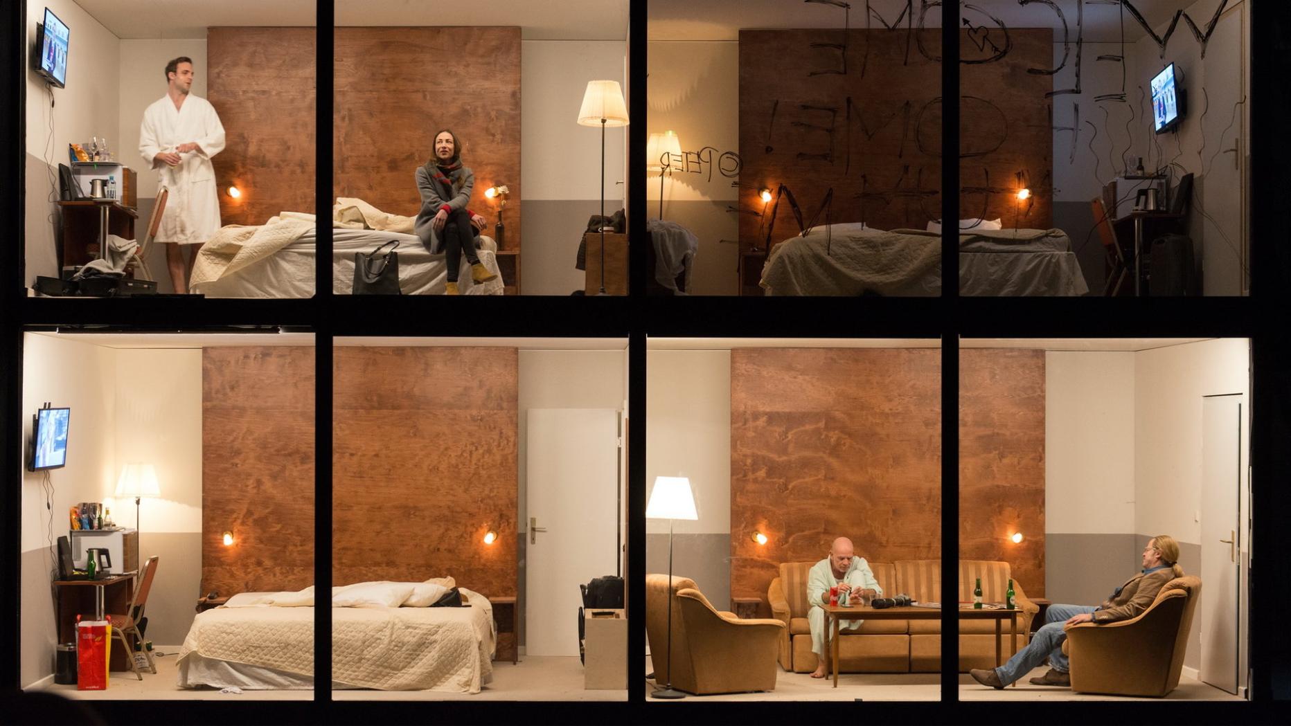 Ausstatterin Alice Babidge hat Simon Stone für seine Soap eine grandiose Szenerie gebaut: In jedem der drei Akte blickt man durch die Glasfassade in drei Stockwerke. Nach der ersten Pause – der Umbau dauert eine halbe Stunde – verlagert sich das Geschehen zwei Ebenen nach oben; das Finale spielt vornehmlich in der Rezeption und im Frühstücksraum.