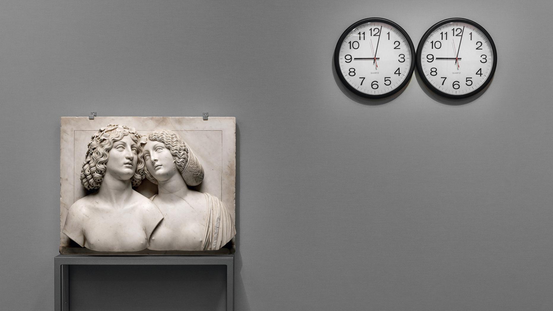 Derlei Bilder lohnen schon den Besuch, doch einige der besten Dialoge gelingen mit vergleichsweise unspektakulären Werken: Zwei Wanduhren von Felix González-Torres etwa fassen neben Tullio Lombardos Relief eines jungen Paares (1505 – ’10) ein zeitloses Motiv hoch poetisch ein: Es geht um die Endlichkeit der Liebe, die Möglichkeit des Verlusts, wenn ein Partner stirbt/eineUhr stehen bleibt. Da bei González-Torres die Idee mehr zählt als das Material, konnten die Uhren billig im Handel gekauft werden, erzählt Sharp.