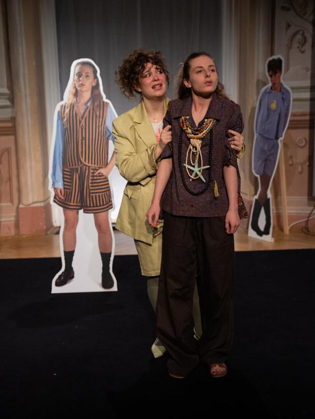 Jakob Leanda Wernisch gelingt es, die Geschichte alles andere als platt zu erzählen: Er legt seinen Figuren eine hohe Sprache – mit Anklängen an die Klassik – in den Mund. Es geht um Macht und Ohnmacht, um Gruppendynamik und Egoshooting. Wernisch, 2002 in Wien geboren, brachte sein Debütstück „Bent Boys Boi Band“ als Regiestudent am Mittwoch im Max Reinhardt Seminar zur Uraufführung – in einem kongenial passenden Saal. Denn die barocke Ausgestaltung ist nur gemalt. Wernisch blickt eben hinter die Glitzerfassade der Stars. Und daher kommen auch lebensgroße Pappfiguren aus der Glanzzeit (sie erinnern an die Bravo-„Starschnitte“) zum Einsatz.
