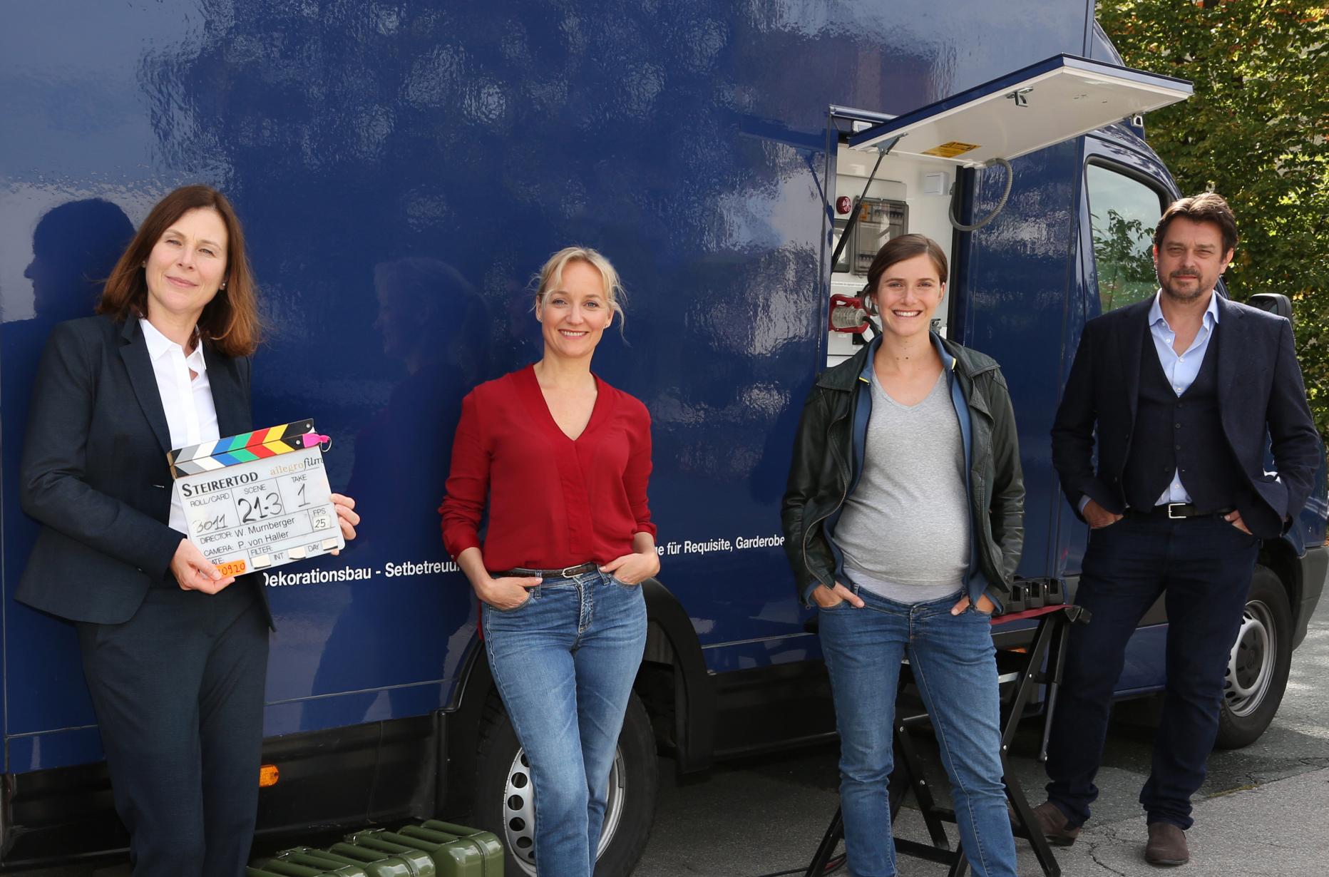 Bettina Mittendorfer, Eva Herzig, Miriam Stein und Harry Prinz bei den Dreharbeiten (v.l.n.r.)