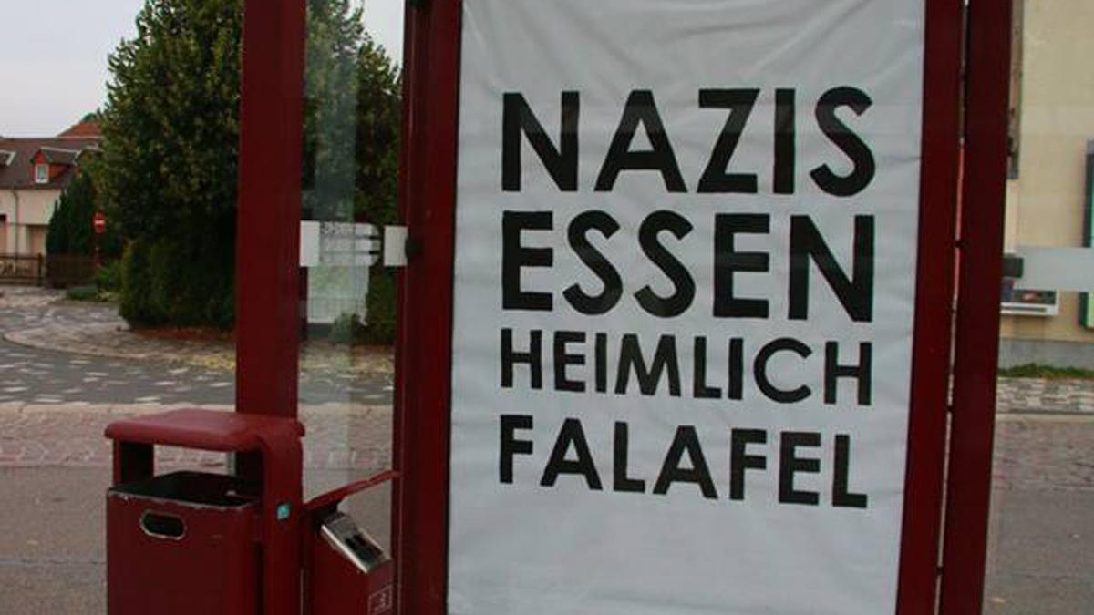 Bei der "Intervention" wurden in einer Guerilla-Aktion insgesamt 21 Plakate in Glaskästen an Haltestellen gehängt. In nur 90 Minuten. Dabei wurden die Scheiben nicht einfach nur überbklebt, sondern die Kästen sorgsam geöffnet und die darin hängende Werbung ersetzt. Zu lesen sind Sätze wie "Nazis essen heimlich Falafel", "Wer kein Selbstbewusstsein hat, braucht ein Nationalbewusstsein" oder "Der Fuchs ist schlau und stellt sich dumm. Der Nazi macht es andersrum."