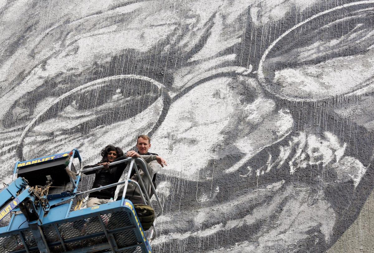 epa04046728 German street art artist Hendrik Beikirch (L), 39, and his Indian colleague Anpu Varley, 33, pose in front of their 50-meter-high portrait of Mahatama Gandhi, also known as Father of the Nation, seen on a wall of the police headquarters in New Delhi, India. Beikirch and Varley painted the huge artwork on the occasion of Gandhi's death anniversary on 30 January. EPA/MONEY SHARMA