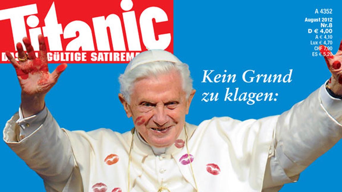 Auch das August-Heft des Frankfurter Satiremagazins "Titanic" hat den Papst auf dem Titelbild - diesmal mit bunten Kussmündern und Handabdrücken auf dem weißen Gewand. "Eigentlich müssten wir ihn damit versöhnt haben", sagte Chefredakteur Leo Fischer der Nachrichtenagentur dpa am Freitag. Das Magazin hatte auf seinem Titel im Juli den Papst von vorn und hinten gezeigt - einmal mit gelbem, einmal mit braunem Fleck auf der Soutane. Dazu die Überschrift mit der Anspielung auf die Enthüllungsaffäre im Vatikan: "Halleluja im Vatikan - Die undichte Stelle ist gefunden!" Das Titelbild wurde verboten, nachdem die katholische Kirche interveniert hatte.