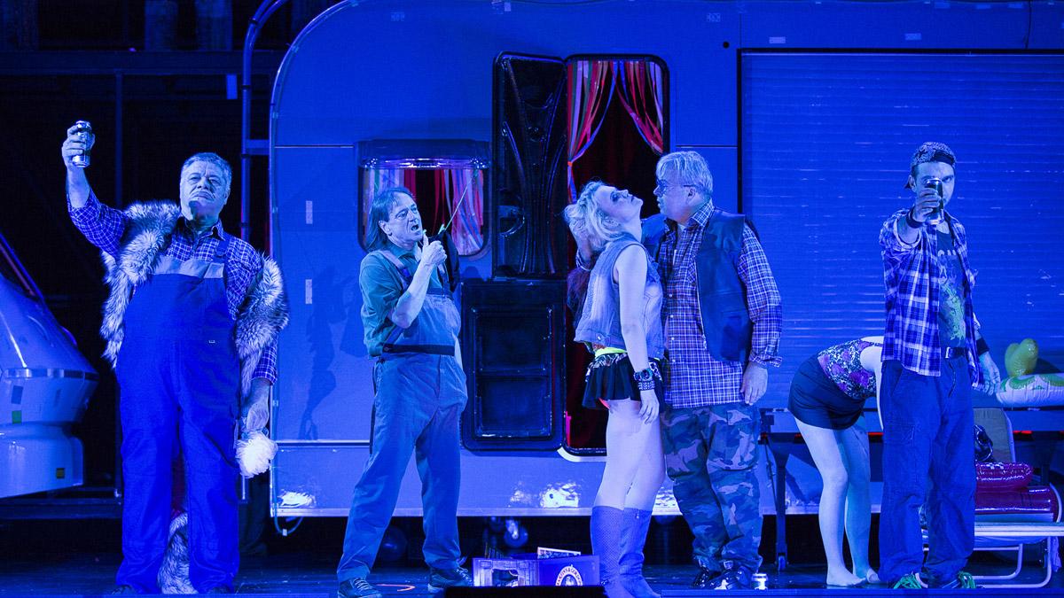 Trashyâ ist die Szenerie, vollgestopft bis obenhin. In die Höhe gestaffelt stehen WohnwĂ€gen mit mehrstufigen Spielebenen (Rebecca Ringst). Davor wimmelt es von einem bunten Völkchen in grellen FantasiekostĂŒmen (Ingo KrĂŒgler), wie aus einem Comic entsprungen.