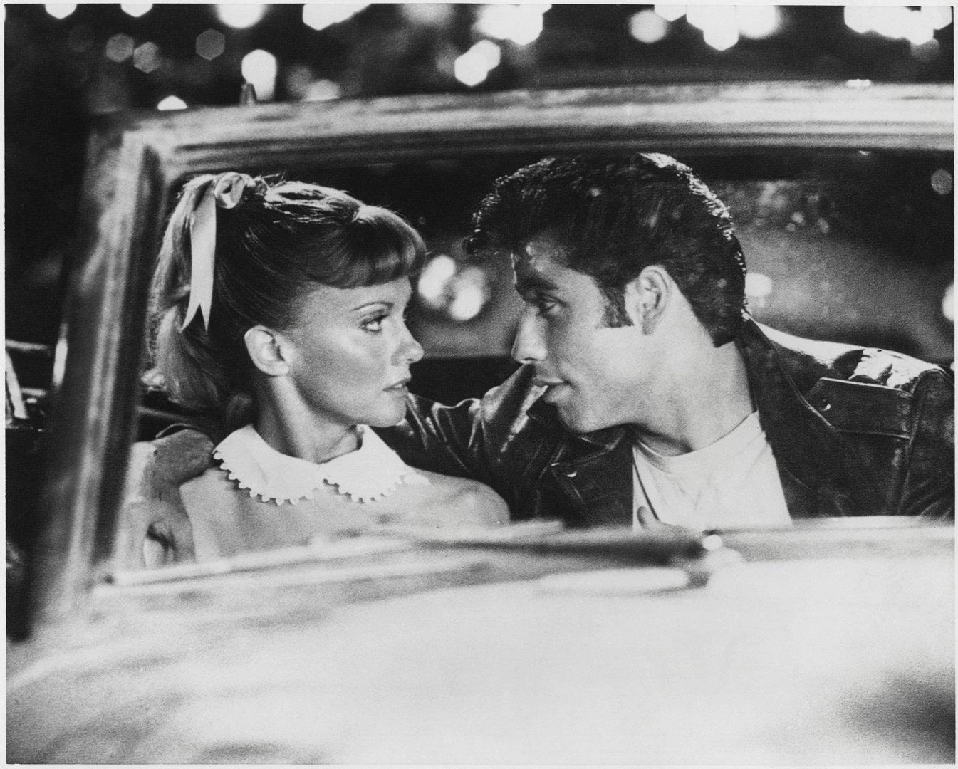 John Travolta versucht vergeblich, Olivia Newton-John während einer Filmvorführung im Autokino zu verführen: „Grease“