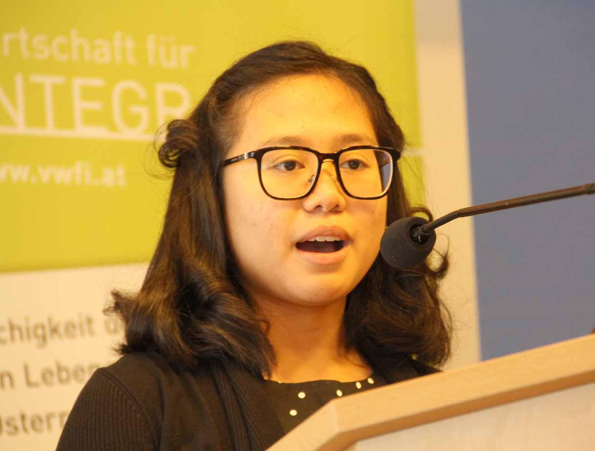 Zsofia Urban (Ungarisch/ BHAK 1 Wels, OÖ) erzählte von dem Beispiel, dass sie einer verzweifelten Mutter mit Kindern ein Zugticket gekauft habe und wie sie selbst es genossen hatte, helfen zu können.