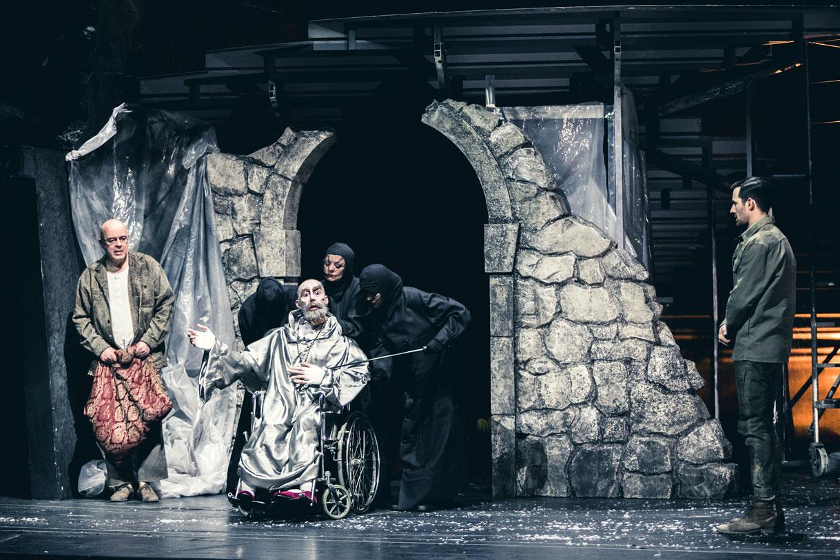 Dreht sich die Bühne tauchen Stufen auf, die Assoziationen sowohl an den Tempelberg als auch an die Via Dolorosa, den Leidensweg von Jesus Christus in der Metropole der drei großen EinGott-Welt-Religionen weckt. Gotthold Ephraim Lessings „Nathan der Weise“ im Wiener Volkstheater verwendet weitestgehend die gereimte Sprache des vor fast 250 Jahren entstandenen Werkes und widmet sich vor allem der Rahmenhandlung für die später oft auch davon losgelöst zitierte Ringparabel. Es ist DAS klassische Stück, dem Aufklärung und Toleranz zugesprochen wird. Der jüdische weise Kaufmann, der ein Christenmädchen adoptiert, der großherzige muslimische Sultan, der vom als Weise geltenden Nathan wissen will, welcher Glaube der wahrhaftige sei und schließlich der christliche Patriarch. Der ist hier die Parade-Puppe des Regisseurs und eben für seine vielfältigen, mittlerweile in etlichen Bühnenstücken als Protagonist_innen agierenden Puppenköpfe.
