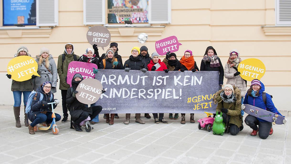 „Jedes 5. Kind in Österreich ist von Armut betroffen oder bedroht.“. Darauf machte die Bundes-JugendVertretung am Dienstag mit einer öffentlichen Aktion aufmerksam. Der Auftritt auf dem Platz der Menschenrechte vor dem MuseumsQuartier Wien mit Transparent und kaputtem Spielzeug als Symbol dafür war der Auftakt zu einer Kampagne unter dem Motto „Armut ist kein Kinderspiel“.