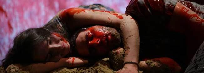 Pur, teils roh. Liebe und Hass, Nähe und Alleinsein. Und das ziemlich gefühlsecht – rüber gebracht von zwei jungen Darsteller_innen, Michèle Rohrbach und Florian Hackspiel. Dazu stets passende Musik und zwei spärlich-üppige Bühnenelemente: ein riesiger Haufen Sand – so runde sechs Tonnen und eine große im Halbrund angebrachte Stoffwand, schon vorab stark mit roter Farbe angeschüttet, was im Laufe des Stücks noch actionreich mehr wird.