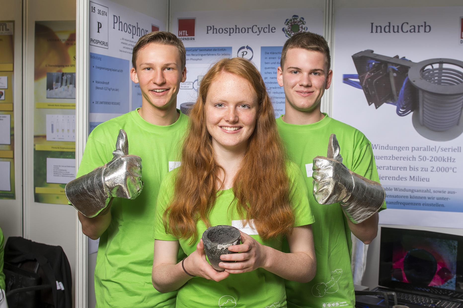 Massachusetts Institute of Technology). Sie kamen nicht nur auf die Idee, auf Methoden, den Phosphor in der Klärschlamm-Asche ausfindig zu machen, sie konstruierten auch einen „Reaktor“ mit dem wichtigen Spurenelement gewonnen werden kann: Einen Grafit-Tiegel, der durch Induktion (Magnetfeld) auf Temperaturen bis 2000 Grad erhitzt werden kann. Gewonnen haben die drei auch die Science-Kategorie – und die Teilnahme am Europäischen Schwesterbewerb von Jugend Innovativ sowie die an der INTEL ISEF, der internationalen Messe für Nachwuchs-WissenschafterInnen im US-amerikanischen