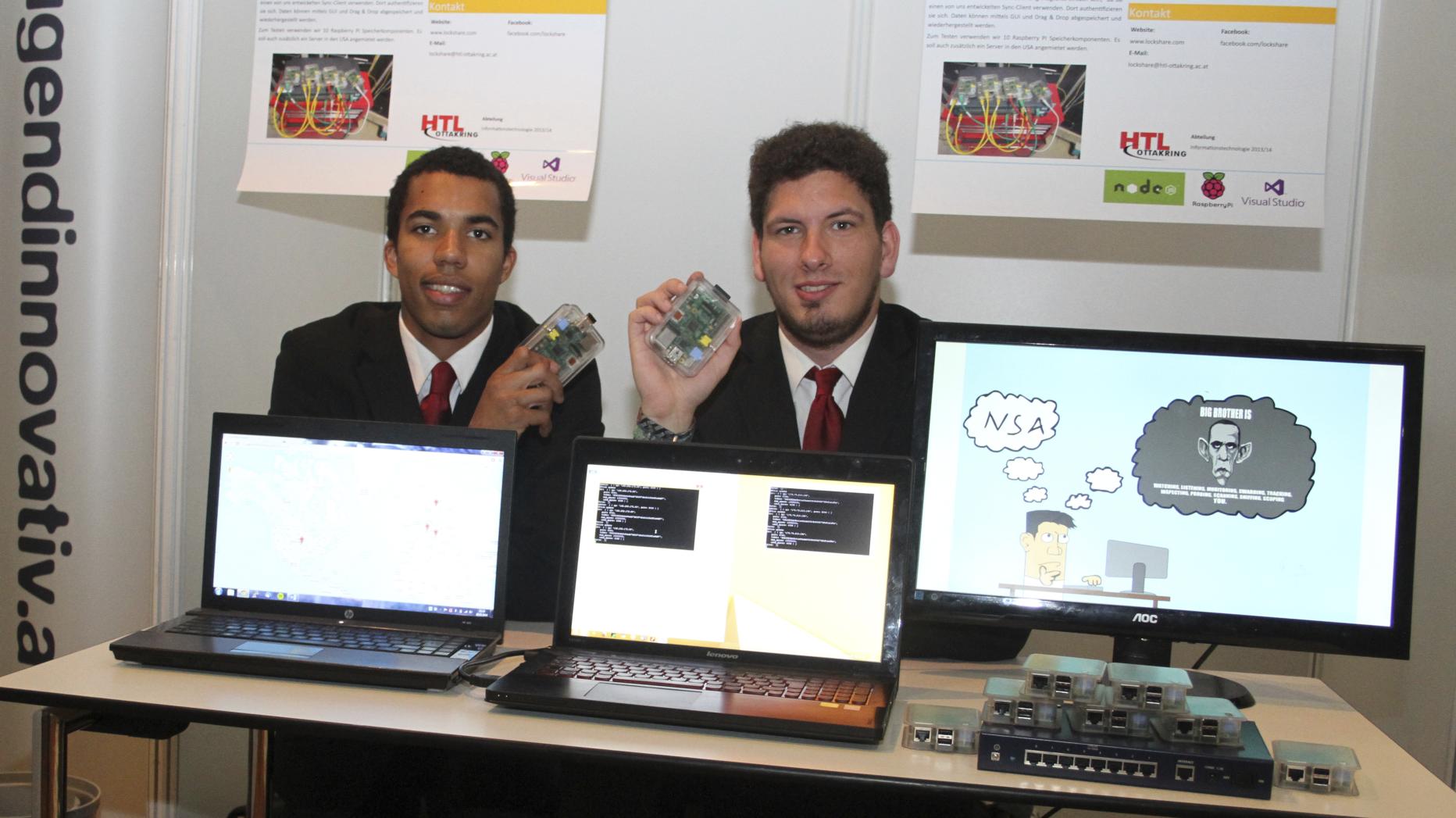 Ungewöhnlich, aber doch, der NSA und ihren Ausspionierungen gebührt ein großes Lob.!? Ohne sie gäbe es das Siegerprojekt des Sonderpreises Technik und Gesellschaft nicht. Paul Pröll und Benjamin Soura von der HTL Ottakring haben ein gefinkeltes System verteilter Speicherung, das sich dem ungewollten Mitlesen entzieht, ausgetüftelt. LockShare – Crowd Storage for All geht auf die Diskussion um Überwachung zurück.