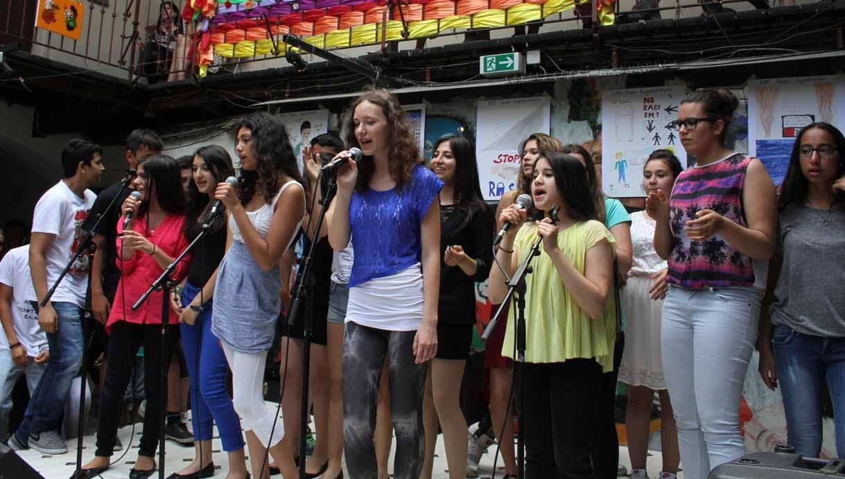 Einen besseren Rahmen hätten die Jugendlichen der Neuen Mittelschule Obere Augartenstraße in Wien für ihre Projektpräsentation gar nicht finden können. Eingebettet in ein Romafest für Schulen im Kulturzentrum Amerlinghaus riss es viele von ihnen von den Sesseln als Ruža Nikolić-Lakatos sang. Sie tanzten auf dem kleinen, engen Platz vor der Bühne. Und dann eroberten die Schüler_innen der beiden vierten Klassen selbst die Bühne. Und rissen ihrerseits mit den Lyrics über die Verfolgung der Ruth Weiss durch die Nazis, über den menschenverachtenden Schwachsinn von Rassismus und die Hoffnung auf ein Miteinander das Publikum mit.