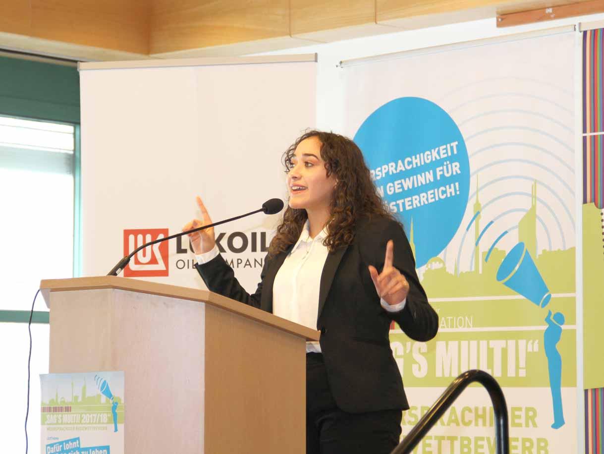 Spannend war, dass die 16-Jährige, die auch mit ihrer zweiten Muttersprache Arabisch oder der wie Englisch auch erlernten Fremdsprache Spanisch antreten hätte können, im Gespräch danach dem Kinder-KURIER gestand, „lange Zeit gar nicht gern vor anderen geredet“ zu haben, „weil sie von einer Lehrerin in der Volksschule gemobbt worden war und deswegen an mangelndem Selbstwertgefühl litt. „Dann bin ich hier in der Schule draufgekommen, dass ich Spaß daran habe, Referate zu halten.“ Doch sogar nach der Anmeldung für „SAG’S MULTI!“ wollte sie sich wieder abmelden, weil ihr Leute gesagt haben, sie könne nicht vor Publikum reden. Ein Lehrer habe ihr zugeredet. Zu ihrem und ihrer Zuhörer_innen Wohl. Mit ihrem Beispiel kann Yasmin Maatouk anderen Mut machen, es sehr wohl schaffen zu können, auch wenn so manche ihre Fähigkeit anzweifeln!