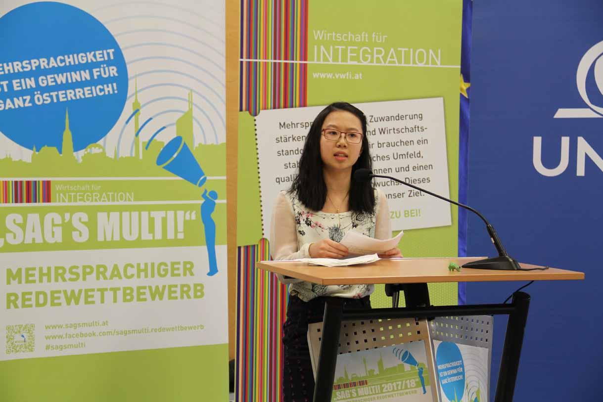 Am dritten der vier Finaltage, der in der Europäischen Mittelschule Neustiftgasse ( Wien) stattfand, traf dies unter anderem auf die Rede von Joyce Hoang (auf Vietnamesisch und natürlich auch Deutsch – das gilt für alle Teilnehmer_innen dieses Bewerbs) zu. Die 16-Jährige vom GRG Bertha von Suttner-Schulschiff (Wien 21) hielt ausgehend von Alltagserlebnissen, wo sie als weibliche Ausländerin doppelt diskriminiert bis abgelehnt werde, ein flammendes, mitreißendes Plädoyer gegen Rassismus und Sexismus. Nur weil sie die erste Hälfte ihres bisherigen Lebens in Vietnam aufgewachsen sei und nun in Wien lebe mit österreichischen Adoptiv-Großeltern, halte sie das nicht davon ab, die gesamte Welt als ihre Heimat zu betrachten, beispielsweise mag sie Schweden und liebe Englisch. Es mache sie wütend, in Schubladen gesteckt zu werden. Aber sie habe für sich beschlossen, sich insofern zu ändern, als sie sich von all den aufgezählten und weiteren Anfeindungen nicht besiegen lassen werde.Aber auch die anderen 32 Reden verdienen Aufmerksamkeit.Hier im Folgenden – wie auch bei den andern Finaltagen – alle 33 Rednerinnen und Redner in Fotos – samt Kurz-Zusammenfassungen ihrer Beiträge.