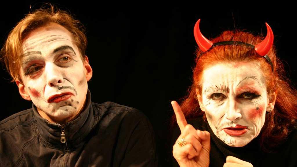 Geheimnisvoll, heimelig, auch ein bissl gruselig – so die Atmosphäre bei „Grimm leuchtet". Ziemlich dunkel, „nur" ein paar Kerzen sorgen für Licht. Vor den Zuschauer_innen-Reihen ein schwarzer Vorhang, der nach vorne auch über einen Teil des Bodens ausgebreitet ist. Darauf Glasscherben, die sich über Projektion auf dem Vorhang „spiegeln". Daneben ein Flügel. Zu musikalischer Live-Untermalung öffnen sich im Vorhang zwei Schlitze. Zwei geschminkte Gesichter erscheinen – das eines Märchen-Erzählduos. Drei Grimm`sche Märchen werden – „nur" mit Worten, Mimik und wenigen Gesten – lebendig. Das weniger bekannte vom Kind mit der Glückshaut, das bekannte von den drei goldenen Haaren, die vom Kopf des Teufels zu klauen sind und schließlich das – wie das erste – weniger bekannte vom Meisterdieb.