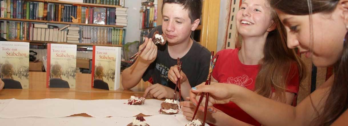 Ein bisschen wirkt es hier wie auf einem Dachboden. Die Treppe rauf, ein kleiner Raum, zwei Stellwände voller Bücher, am anderen Ende eine gemütliche Couch. In der Mitte stehen drei zusammen geschobene Tische, auch hier viele Bücher und ein Laptop. Vorerst sitzt mit Nikola Pilsel, Sarah Rabong und Fanny Pech die Hälfte der zweitjüngsten Jury der jungen LeserInnen, vor sich halten sie das Buch ihrer gemeinsamen Wahl: Torte mit Stäbchen - eine Jugend in Schanghai von Susanne Hornfeck (dtv, Reihe Hanser).