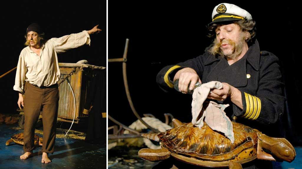 Ein Mensch mit Wildschwein und Meeres-Schildkröte in "Alplantis" eine Stunde auf der Bühne unterwegs