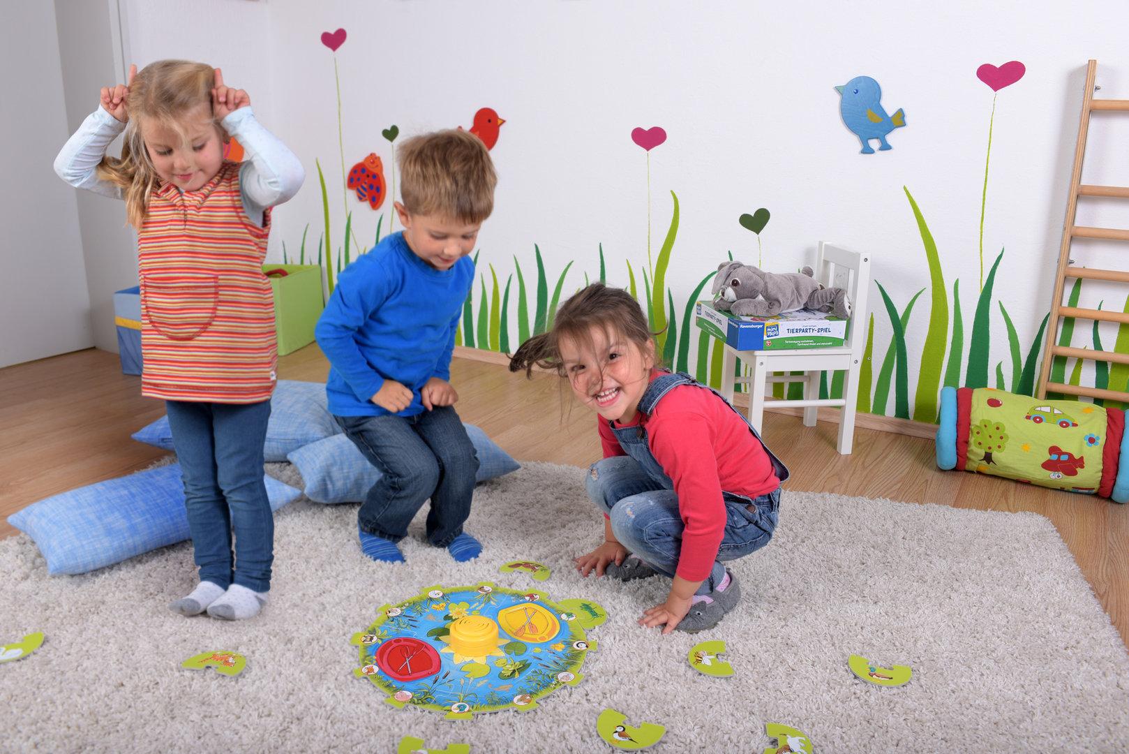 Floki Frosch lädt zur Party am Teich, die Spieler müssen die zwölf Tierfreunde hüpfend, flatternd oder krabbelnd zum Fest bringen – in drei Varianten.
