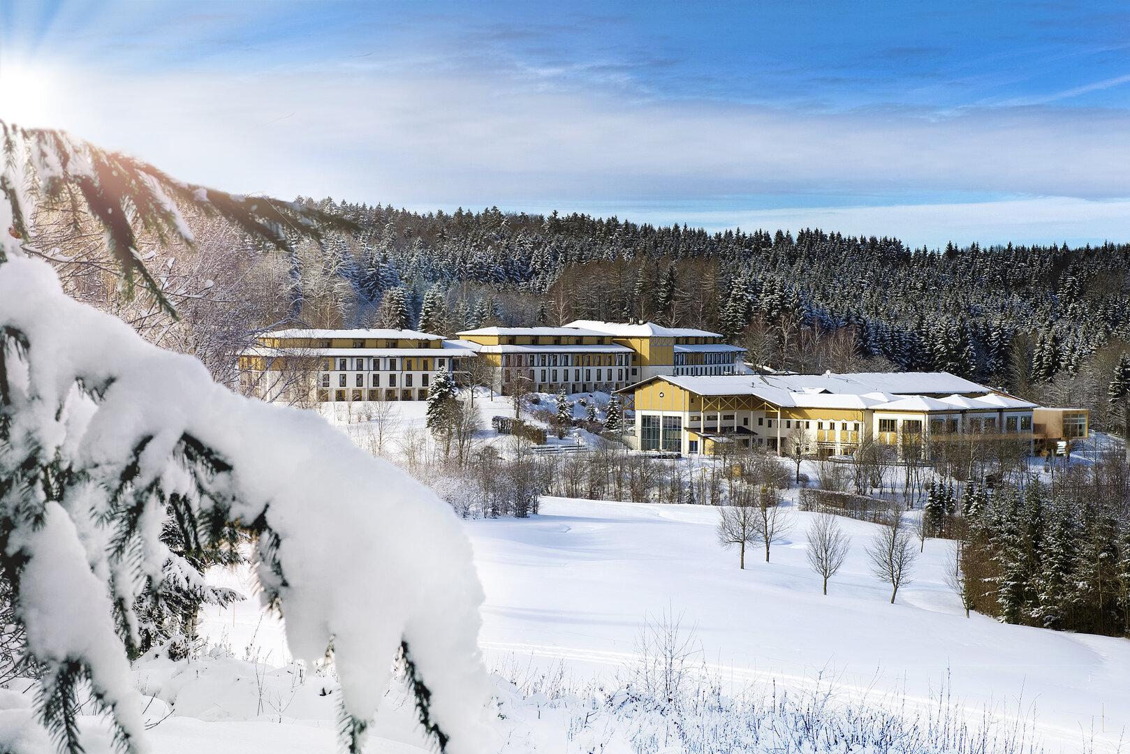 Eine Hotelanlage liegt verschneit vor einem dunklen Wald unter blauem Himmel.
