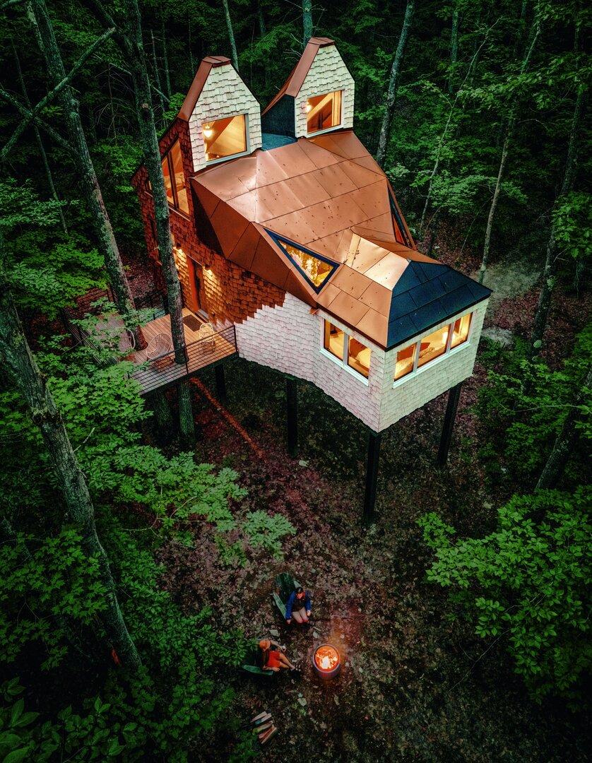 In Pownal im US-Bundesstaat Maine erhebt sich das Copper Fox Tree House wie aus einem schrägen Traum: 2023 von Heidi Richards und Nicholas Cote vollendet, erinnert die 47 Quadratmeter große Holzkonstruktion des Copper Fox Tree House an einen roten Fuchs – Ohren als Lofts, Schnauze als Schlafbereich. Kupferfarbene Töne durchziehen das Interieur und auch den Außenbereich. Regional bezogene Hölzer treffen auf modernen Komfort: Heizung, Klimaanlage, fließendes Wasser und Strom machen das Baumhaus zum luxuriösen Rückzugsort.