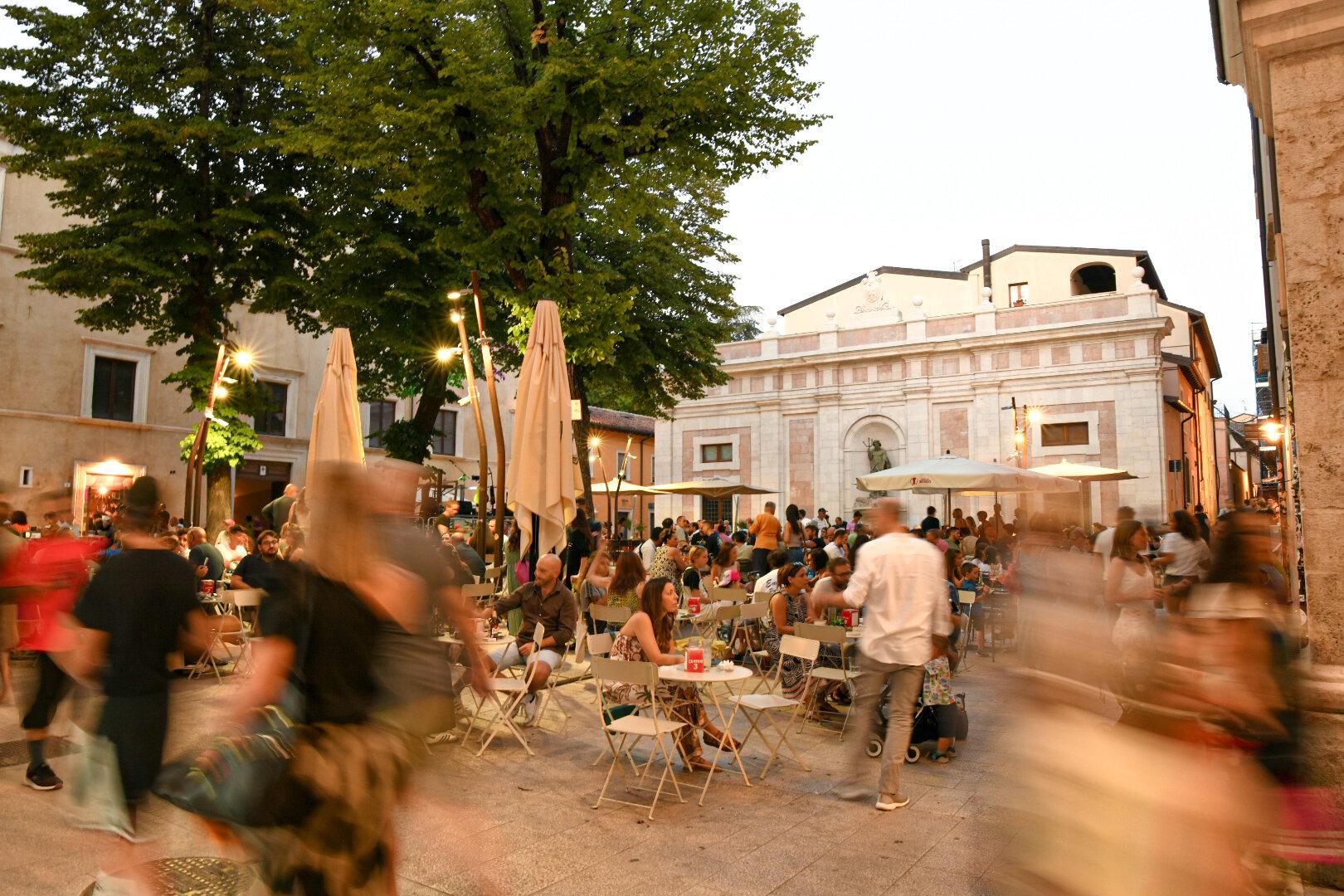 Beim Verdauungsspaziergang trifft sich das pulsierende Leben im Centro Storico von L’Aquila. Der Donnerstag ist der stärkste Ausgehtag, denn L’Aquila ist auch eine Universitätsstadt. Bevor die Studierenden fürs Wochenende nach Hause zu ihren Familien fahren, streifen sie durch die Straßen des Zentrums, plaudern, essen und trinken. Wieder lockt die Piazza Regina Margherita, jetzt ist es die Bottiglieria Lo Zio, die ihre Pforten für die Nachtschwärmer geöffnet hat. Diese erfüllen den ganzen Platz. Ein wohltuendes Gewusel von Italianità.