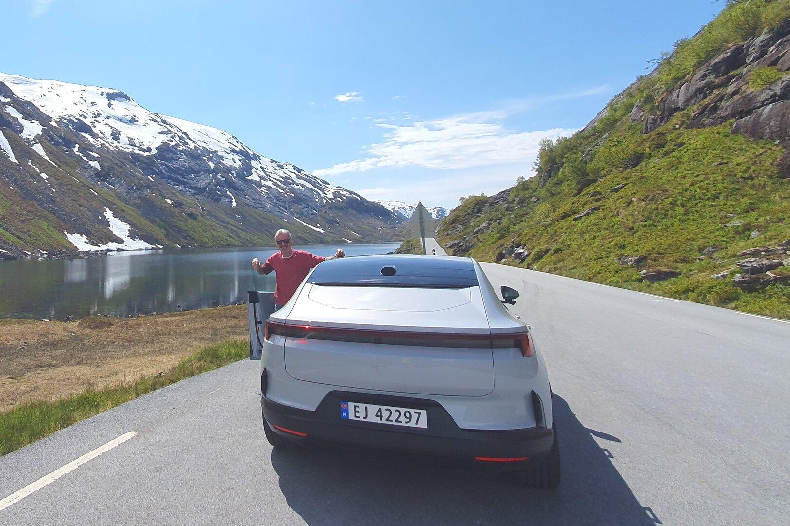 Ein Mann steht neben einem weißen Auto auf einer Straße an einem See, umgeben von Bergen mit Schnee und grüner Vegetation.