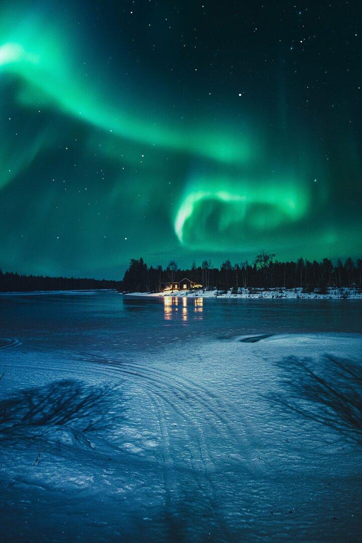 Grünes Polarlicht leuchtet am Nachthimmel über einem zugefrorenen See mit beleuchtetem Haus am Ufer.