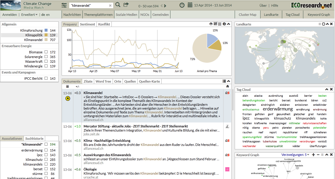 Wer sich neue wissenschaftliche Erkenntnisse ÜBER das Klima erwartet, wird enttäuscht. Vielmehr gehe es "ausschließlich und ganz bewusst um die Kommunikation von Stakeholdern", klärt Scharl, Leiter des Instituts für Neue Medientechnologie an der Modul-Universität, auf. Soll heißen: Das Web-Portal ermöglicht es Interessierten, Diskussionen über Umweltthemen auf einen Blick zu erfassen. Wer bestimmt den Diskurs zum Klimawandel? Welche Themen dominieren wann und wo?