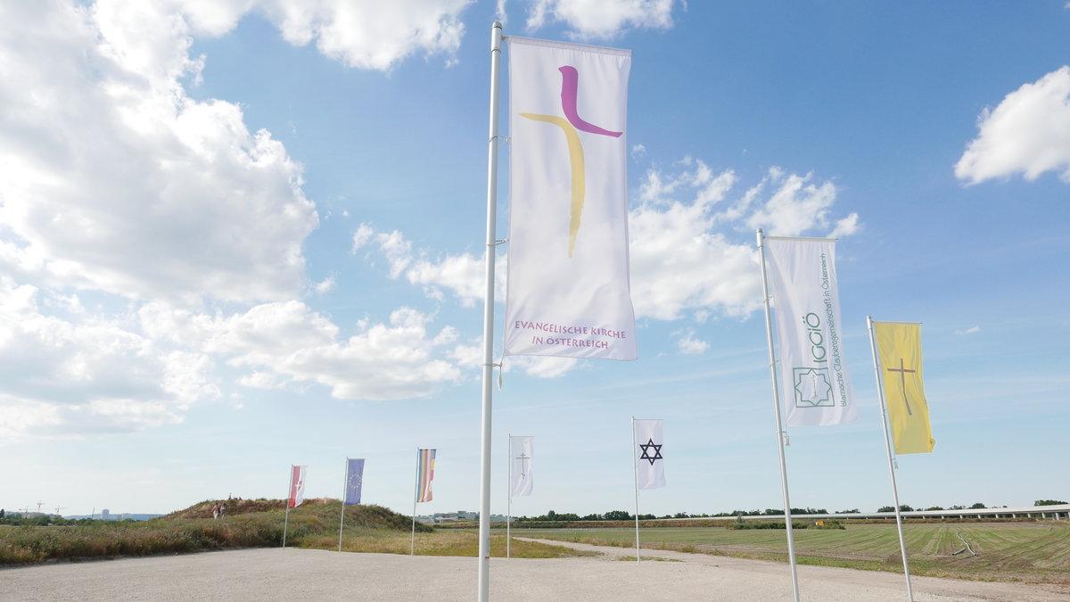 Fahnenmeer in der Seestadt: In der Nähe soll der interreligiöse Campus errichtet werden