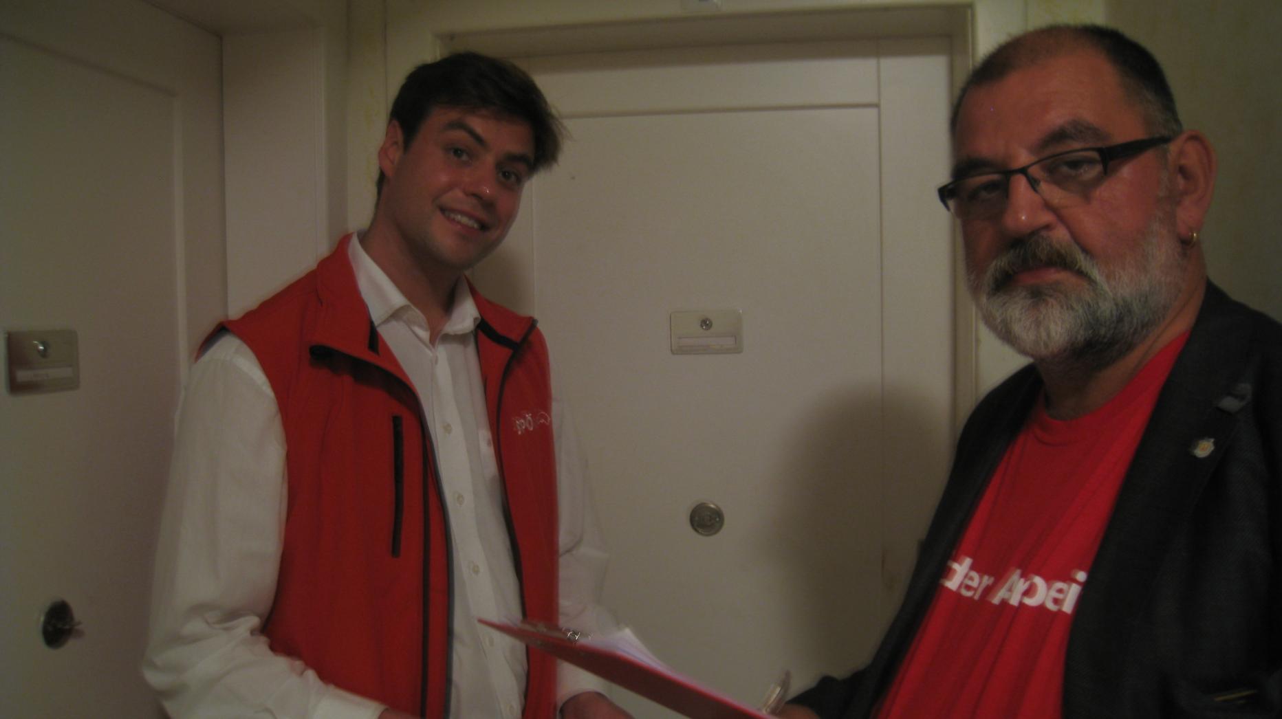 Freundschaft auf der 100er-Stiege! Ronald Schlesinger und Herbert Schweiger waren in den vergangenen Wochen für die SPÖ „obamawahlkämpfen“, in einem Gemeindebau-Agglomerat namens Großjedlersdorf. Dort hat ihre Partei 2010 (bei der letzten Gemeinderatswahl) ihre jahrzehntelange Mehrheit an jene, die Wikipedia als rechtspopulistisch ausweist, verloren. So wie die Beiden sind in Wien 700 Sozialdemokraten unterwegs. Schlesinger und Schweiger sind sich einig: Die Hausbesuche waren höchst an der Zeit!