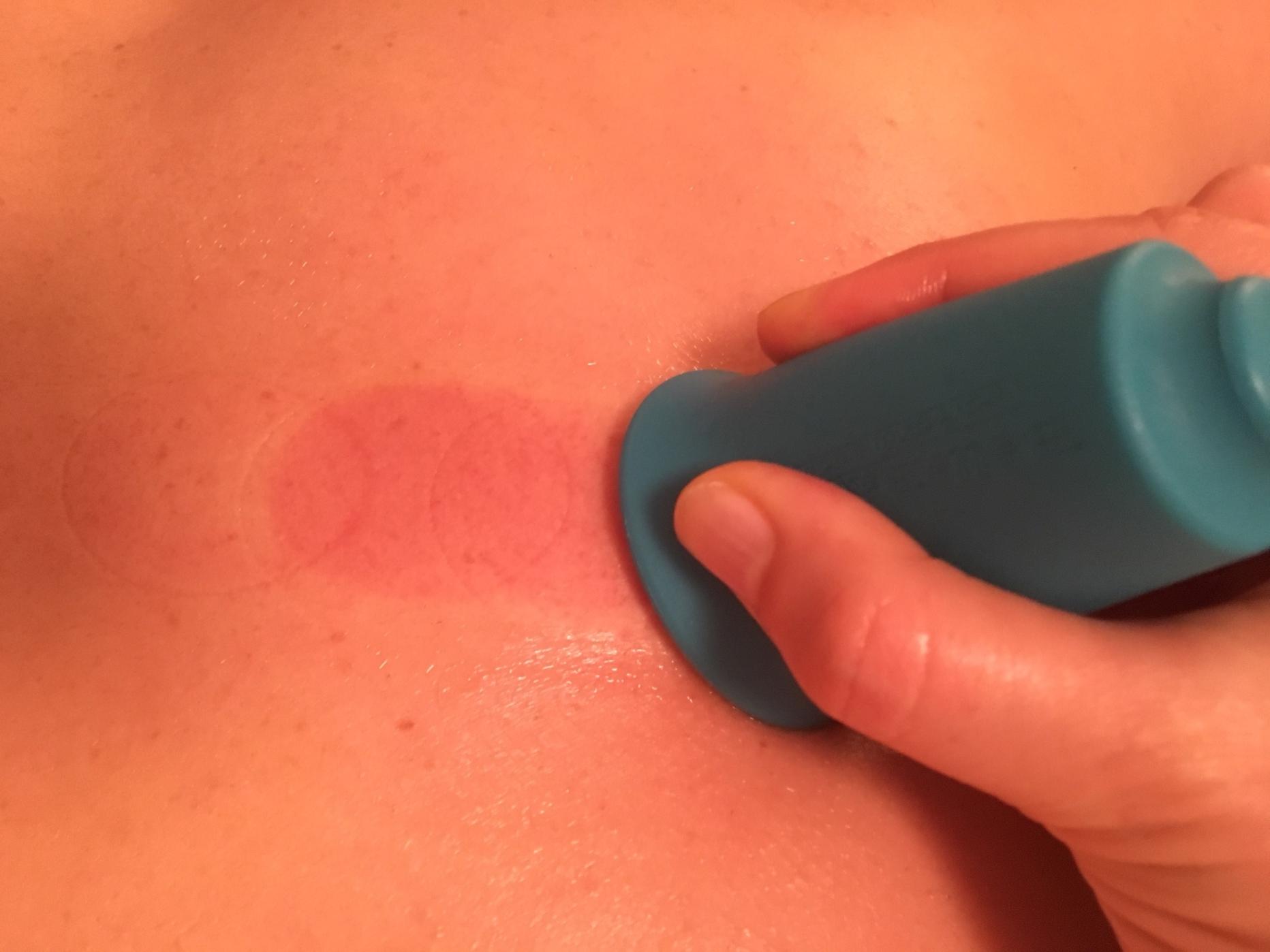Bei einer Massage empfiehlt es sich, die Behandlungsstelle vorher gut einzuölen: Ich drücke BellaBambi leicht zusammen und setze es auf die Haut. Es entsteht ein leichter Unterdruck – dasselbe Prinzip wie beim Schröpfen in der Traditionellen Chinesischen Medizin, wo Glas- oder Kunststoffkugeln vor dem Aufsetzen erhitzt werden, damit sie sich ansaugen. Auf der eingeölten Haut lässt sich der Sauger jetzt einfach (nach Vorliebe schnell oder langsam) hin- und herziehen und mobilisiert dabei die Faszien, Lymphen und den Blutkreislauf. Am Ölfilm, der übrig bleibt, sieht man, welche Schadstoffe von der Haut abgesaugt wurden. Der Pömpel lässt sich leicht mit einem Plopp abziehen – lautloser ist es, wenn man ihn vorher wieder zusammendrückt.