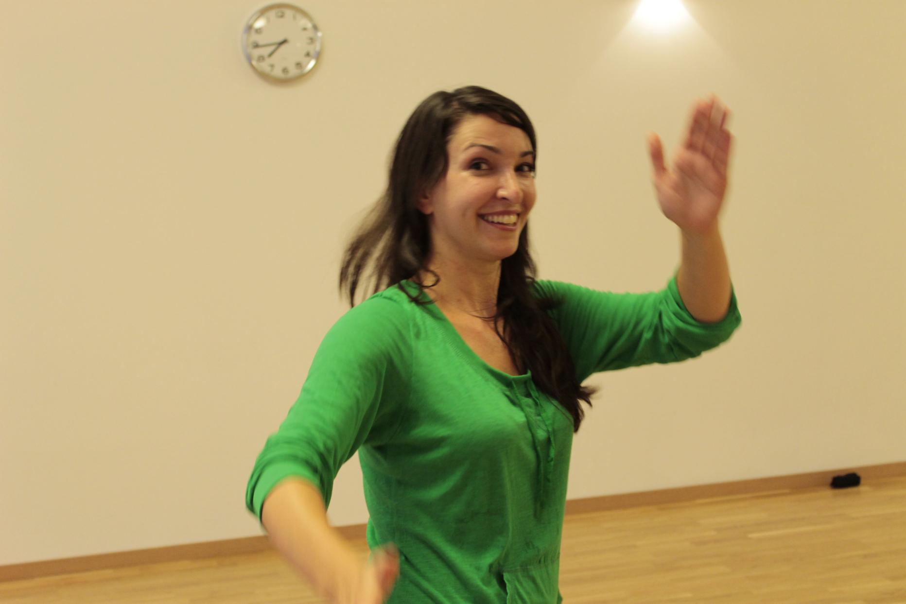 Als Nächstes ist Bollywood dran – wir aktivieren unseren „Powerfinger“ (dabei werden die Hände gespreizt, die Mittelfinger werden zur Handfläche gezogen) und während die Arme auf und ab schwingen, tanzen wir mit hochgezogenen Knien nach vorne und zurück. Dabei wird lautstark geatmet – um nicht zu sagen, gestöhnt. Zwischen den verschiedenen Bewegungsstilen bewundern wir uns selbst im Spiegel mit einem „Aahh“ oder werfen uns wie fürs Fotoshooting in verschiedene Posen.