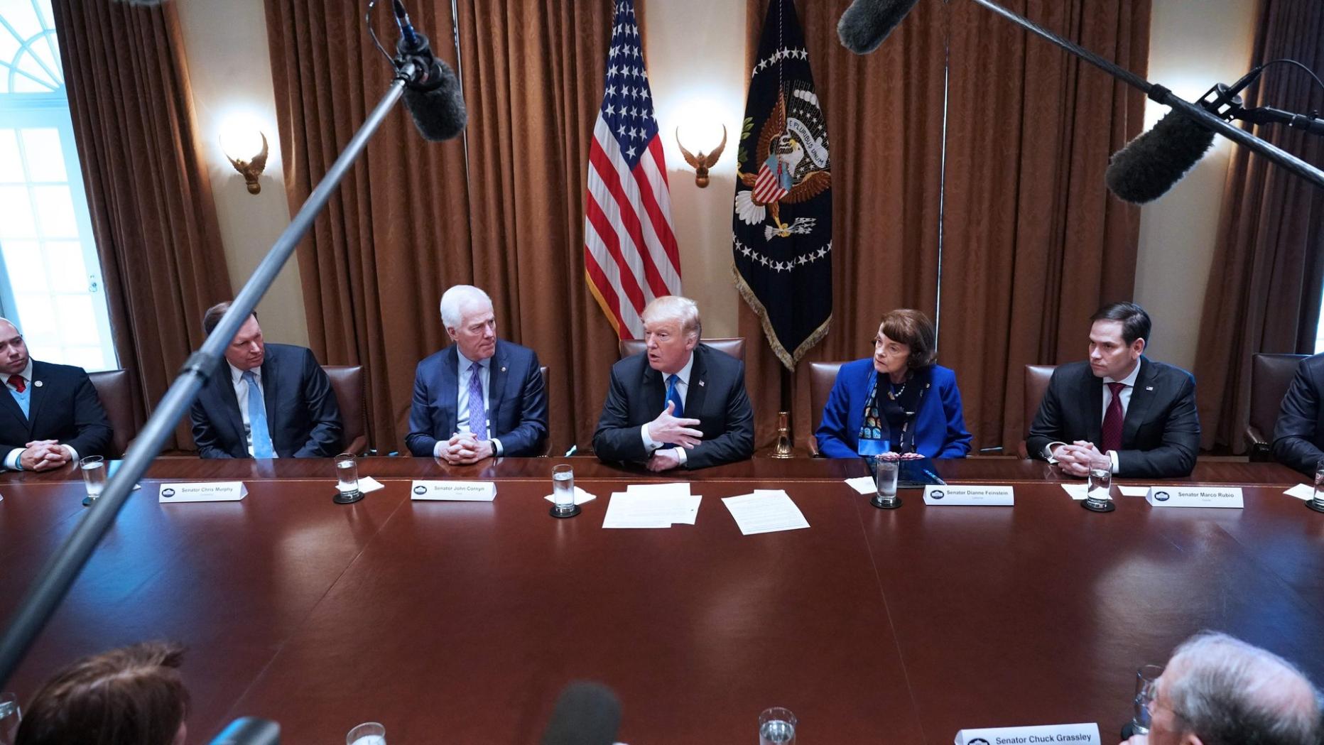 "Wir können nicht warten und Spielchen spielen, wir müssen etwas tun", sagte Trump bei einem überparteilichen Treffen mit Senatoren und Abgeordneten, das in Gänze vom Fernsehen übertragen wurde."Wir sind entschlossen, unsere Trauer in Taten zu verwandeln", sagte Trump. "Diese Schießereien sind nichts Neues, es ist einfach lächerlich", erklärte er.