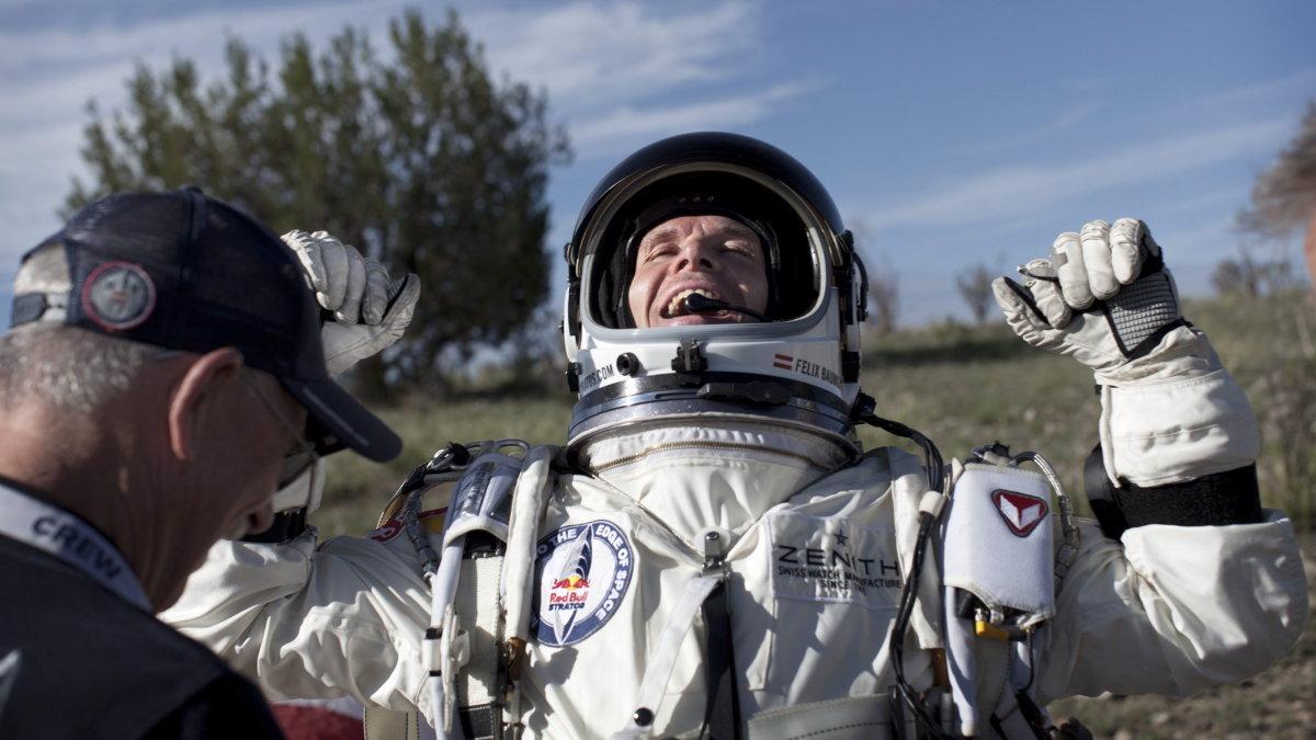 Als er sicher in der Wüste New Mexikos gelandet war, ließ er einen Freudenschrei los und umarmte seinen Berater, den Air-Force-Veteran Joseph Kittinger; dann flog ihn der Helikopter in das nur 15 Minuten entfernte Mission Control Center, wo unter den Mitarbeitern des Red-Bull-Stratos-Teams abermals Jubel aufbrandete.