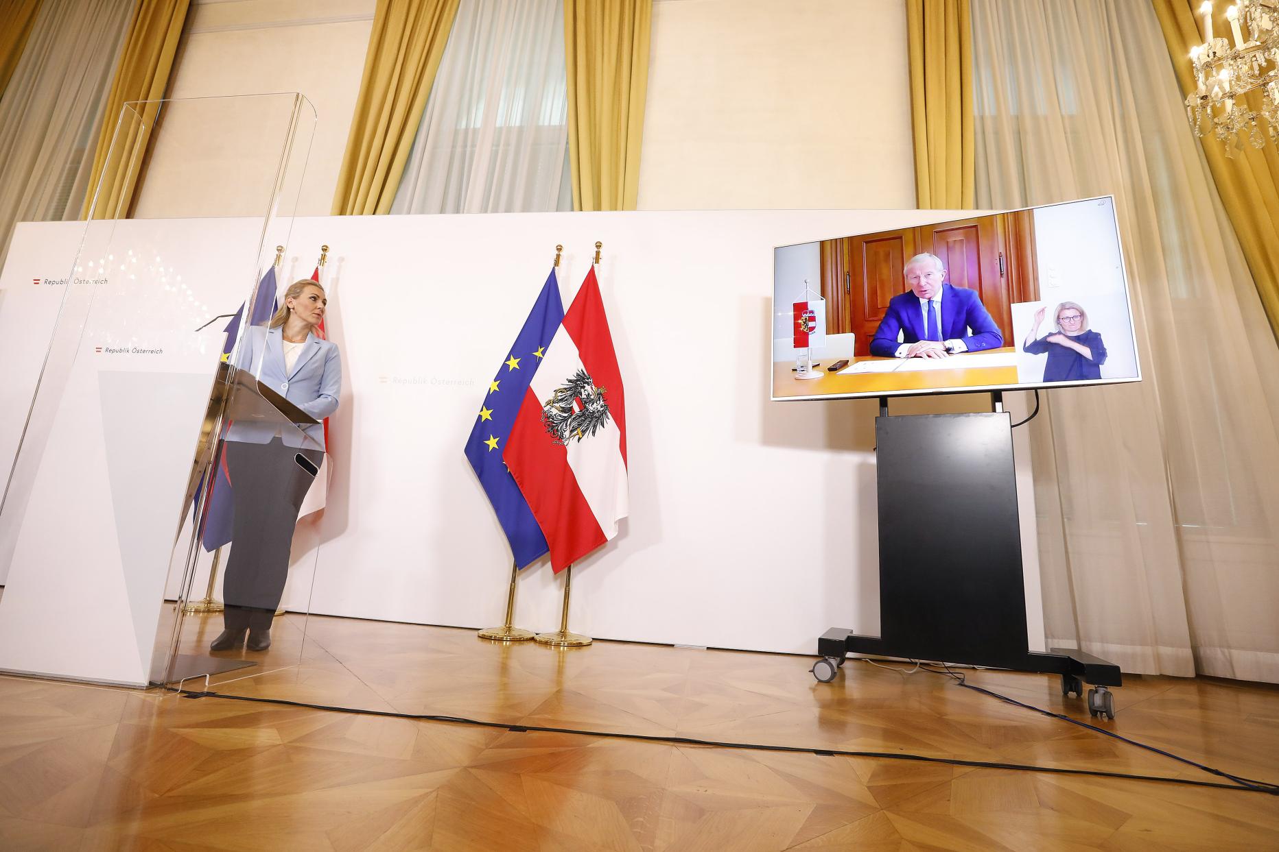 Arbeitsministerin Christine Aschbacher und der per Video zugeschaltete Salzburger Landeshauptmann Wilfried Haslauer