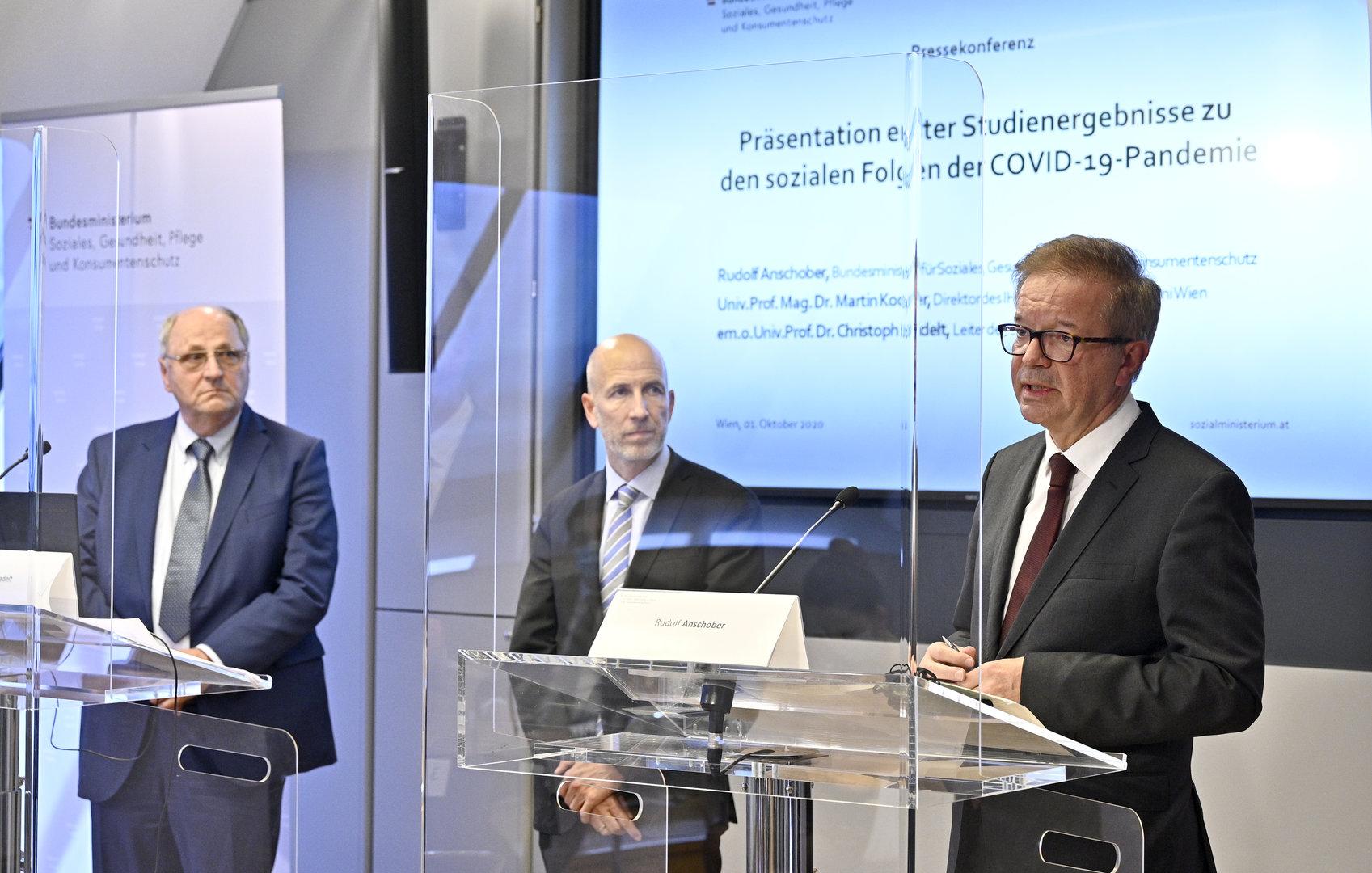 "Unser Ziel ist es, dass aus der Coronakrise keine Sozialkrise wird", so Rudolf Anschober, Minister für Gesundheit und Soziales. Der grüne Minister bekräftigte einmal mehr, dass Österreich bisher gut durch die Krise gekommen sei, man aber nicht nachgeben dürfe. Mit der von ihm in Auftrag gegebenen Studie will er sich die soziale Situation spezifisch anschauen. Die Krise habe zu Verschiebungen geführt, denen man auf den Grund gehen und sie analysieren müsse, so Anschober.