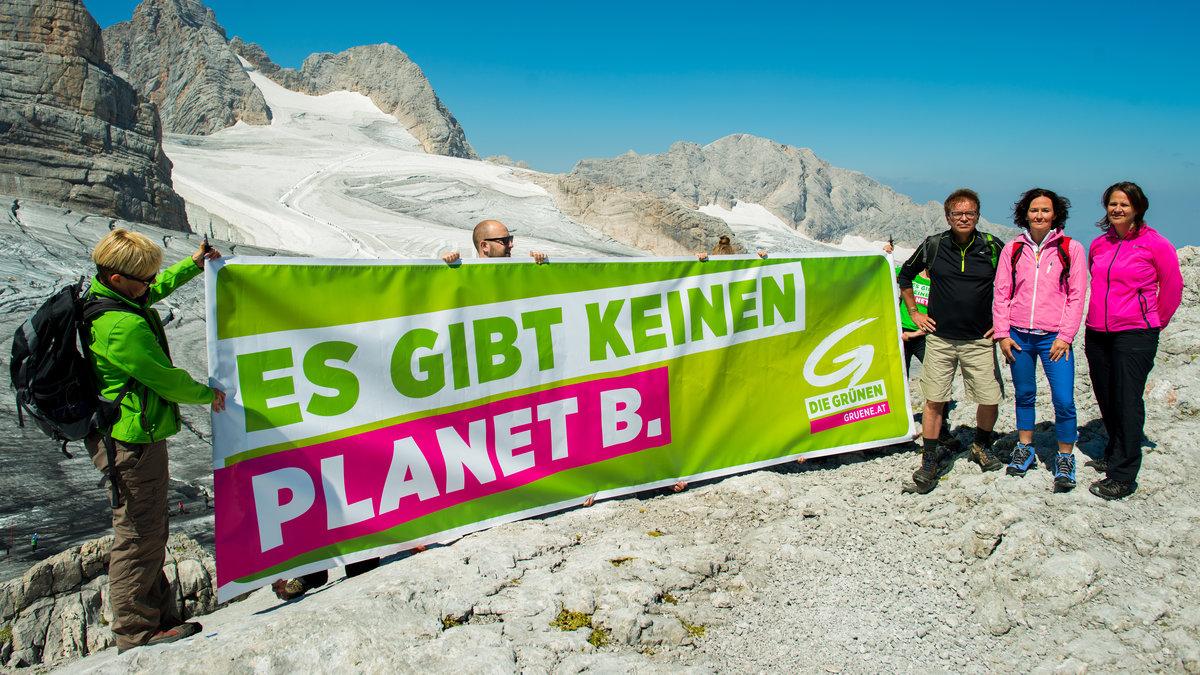 Bei einem Ausflug auf den Dachstein geißelten Grünen-Chefin Eva Glawischnig, OÖ-Landesrat Rudi Anschober und Christiane Brunner, Umweltsprecherin der Grünen, die von "falschen Prioritäten" geprägte Klimapolitik der Bundesregierung. Zentraler Slogan der Ökos: "Es gibt keinen Planet B."