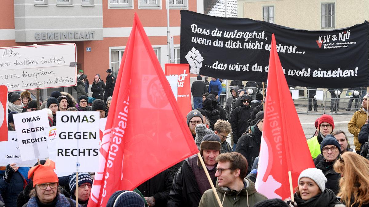 Während der zweite rechte Kongress "Verteidiger Europas" in Oberösterreich im Wasserschloss Aistersheim am Samstag tagt, haben sich rund 200 Demonstranten laut Schätzung der Polizei um 14.00 Uhr zur Kundgebung des Bündnisses "Linz gegen Rechts" am Dorfplatz in Aistersheim versammelt. Etliche von ihnen waren mit zwei Bussen aus Linz und Wien angereist, viele Schaulustige aus dem Ort mischten sich trotz der Kälte dazu, 150 Polizisten sorgten dafür, dass der Kongress mit seinen rund 600 Teilnehmern nicht gestört wurde.