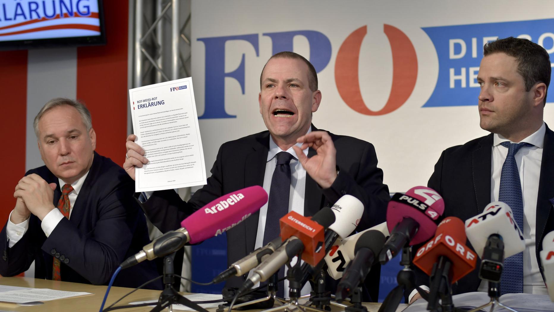 Schritt 1 ist eine "rot-weiß-rot Erklärung", Harald Vilimsky verliest sie vor Ort.