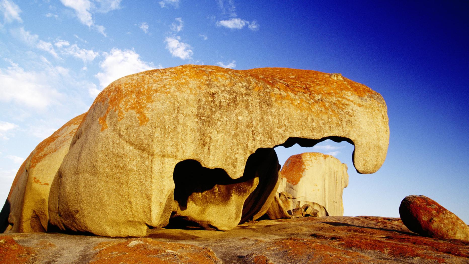Nach zwei Stunden bestaunen wir eine Laune der Natur. Sie ließ vor über 500 Millionen Jahren die Remarkable Rocks (bemerkenswerte Felsen) aus Granit entstehen. Wir stehen unter einem Elefantenrüssel aus Stein, der durch Wind, Regen und Wellen geschliffen wurde. Skurril. Die orange Farbe der Formation entsteht durch Flechtenbewuchs. Jane schlägt vor, bei Sonnenuntergang noch einmal wiederzukehren. In der Zwischenzeit könnten wir eine kleine Tour durch die Nationalparks machen.