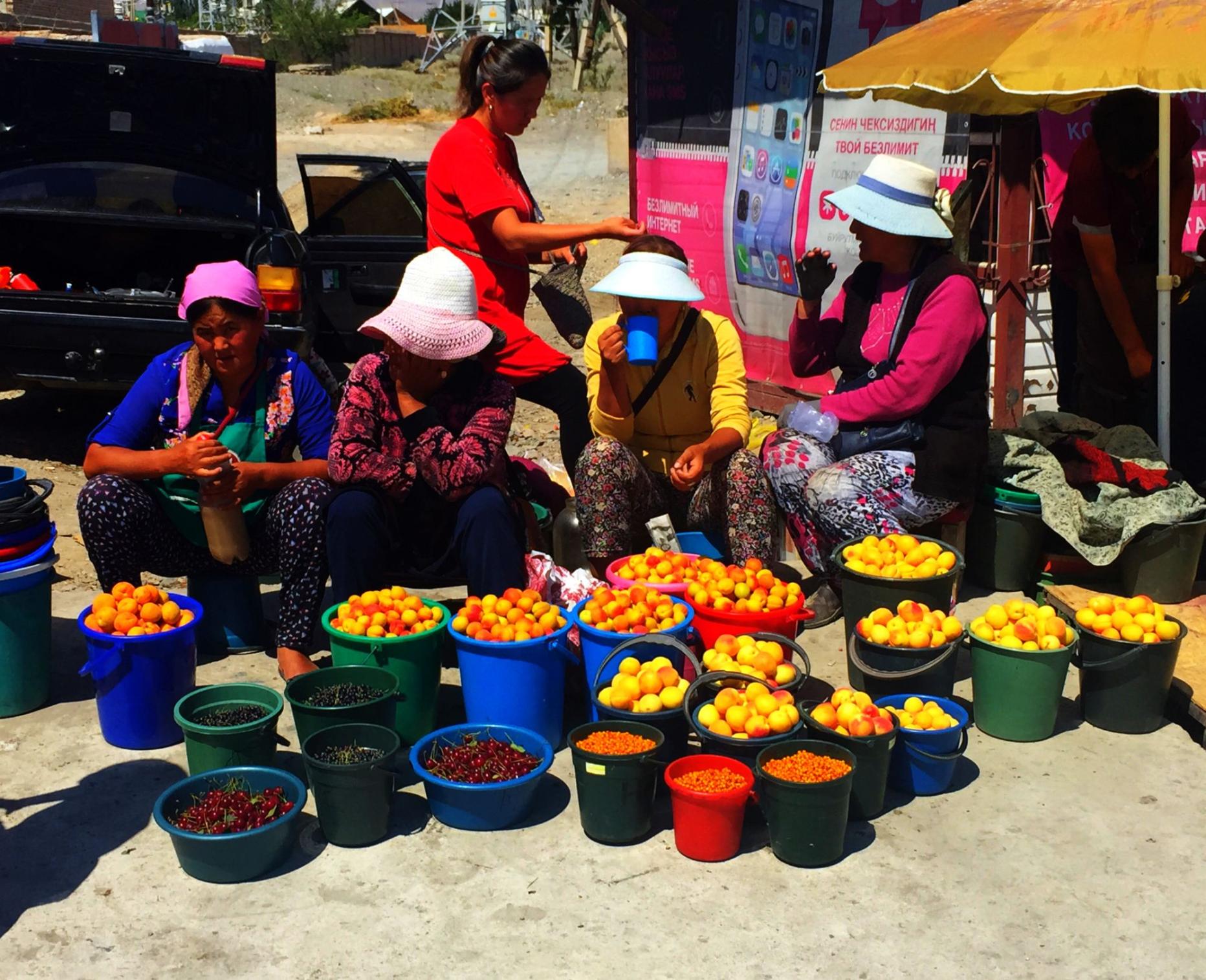 Nach dem Frühstück geht's ab zu Vladimir ins Konsulat, wo er uns noch letzte Anweisungen gibt, wie wir am besten zu seiner Frau ins Ressort an den wunderschönen Yssykköl See kommen. Auf seinem Schreibtisch entdecke ich auch ein Foto, das ihn gemeinsam mit unserem Aussenminister Sebastian Kurz und dem Generalsekretär des BmeiA in Österreich zeigt und auf welches er natürlich sehr stolz ist. Wir fahren nach einem Kaffee zügig los, decken uns am Weg noch mit geräucherter Forelle, deren Duft uns seit Beginn des Sees in die Nase steigt, ein (die Verkäuferin trägt ein Vermögen in Gold in ihrem Gebiss mit sich rum) und kommen schließlich nach Durchfahrt der kleinen Ortschaft Чон-Сары-Ой (Chong-Sary-Oy) zum Ressort Ak Maral inmitten von Bergen direkt am Yssykköl See.