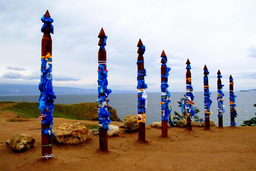 Hinter Jelanzy durchfahren wir die Tascheransteppe auf einer nicht befestigten Straße, links und rechts davon verlaufen ebenfalls kleine "Schleichwege", kaufen uns am Wegrand noch für knapp 3 Euro Holz für ein Lagerfeuer und erreichen schließlich den Primorski-Pass auf etwa 1000 Meter Höhe, an dessen höchstem Punkt ein großer Obo, eine schamanische Opferstelle mit einer Statue liegt. In den burjatisch geprägten Regionen ist der Schamanismus weit verbreitet, überall sieht man heilige Orte, Opferstellen, magische Orte, Felsen oder ähnliches, meist mit bunten Fähnchen geschmückt und vielen Münzen davor und rundherum. Vom Pass haben wir zum ersten Mal einen herrlichen Blick auf den Baikalsee, das dahinterliegende Baikalgebirge und die Insel Olchon.