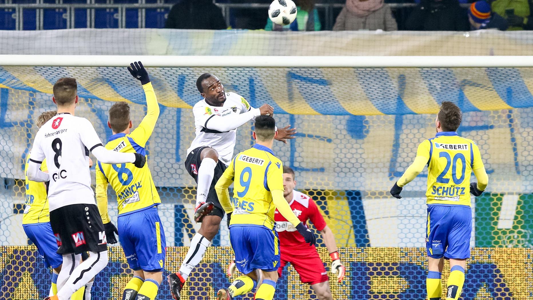 In der ersten Hälfte hielten sich die Höhepunkte noch in engen Grenzen, wobei die Gäste immerhin Halbchancen verzeichneten. In der 16. Minute flog ein Weitschuss von Patrick Salomon ans Außennetz, sieben Minuten später landete ein Kopfball von Louis Ngwat-Mahop in den Armen von St. Pöltens Goalie Filip Dmitrovic. Der Schlussmann war auch in der 42. Minute bei einem Schuss von Adrian Grbic zur Stelle.