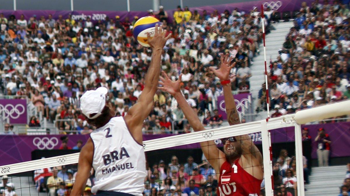 Mit dem ersten Donnerschlag begannen die Brasilianer, ihre Stärken auszuspielen. "Welcome to London", schrie der Platzsprecher, als die ersten Tropfen fielen. Und "Let’s party in the rain", als es so richtig zu schütten begann. Als "Block Monster" wird der 2,03-Meter-Mann Alison bezeichnet – und Sonntag wurde einmal mehr klar, weshalb. Emanuel zeigte die technische Raffinesse eines Olympiasiegers, der er seit dem Jahr 2004 tatsächlich ist – 21:17. Also Showdown im Sonnenschein. That’s London.