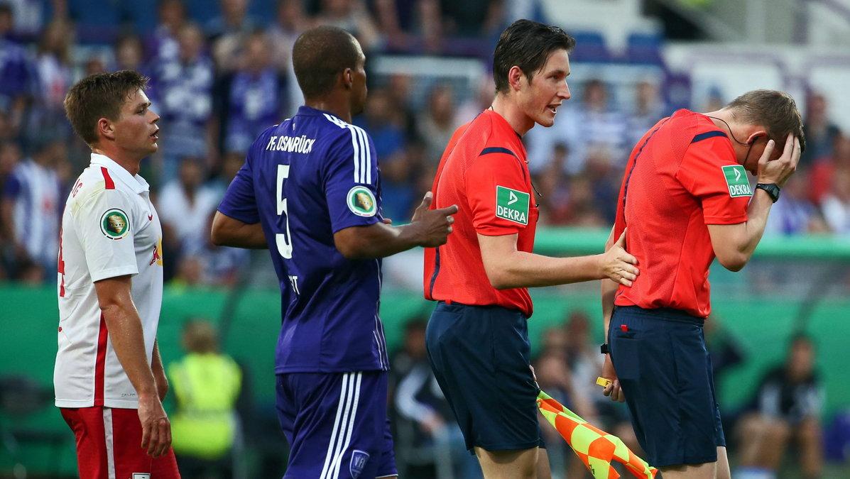 Beim Spiel zwischen Osnabrück und RB Leipzig wurde der Schiedsrichter mit einem Feuerzeug am Kopf getroffen.